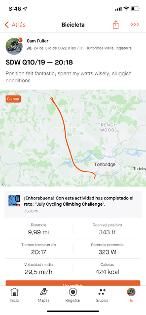 It's a challenging but really fun course, loads of fast sections and the undulating run from Groombridge to Hartfield is class. Finished with 361W normalised for 32 minutes.
